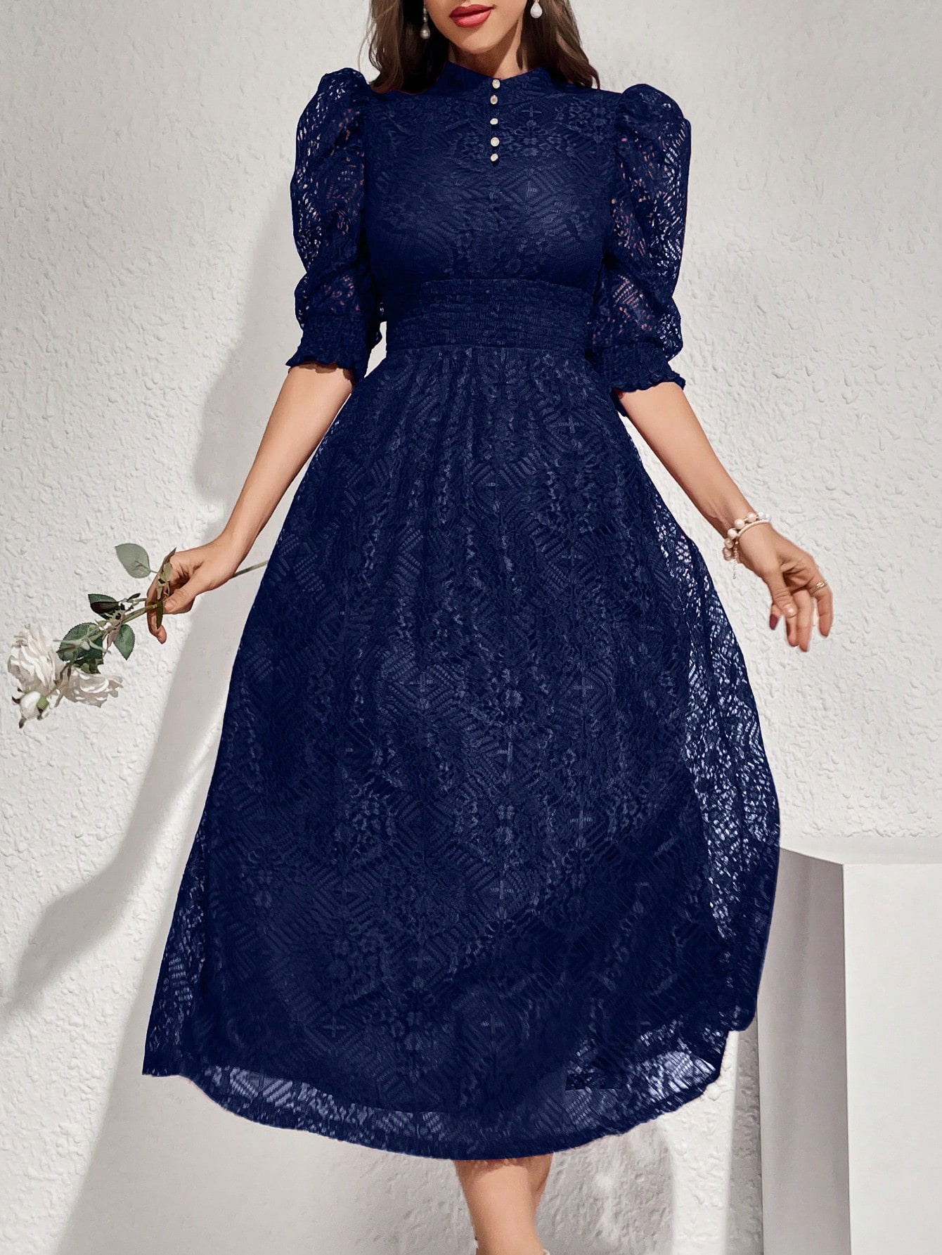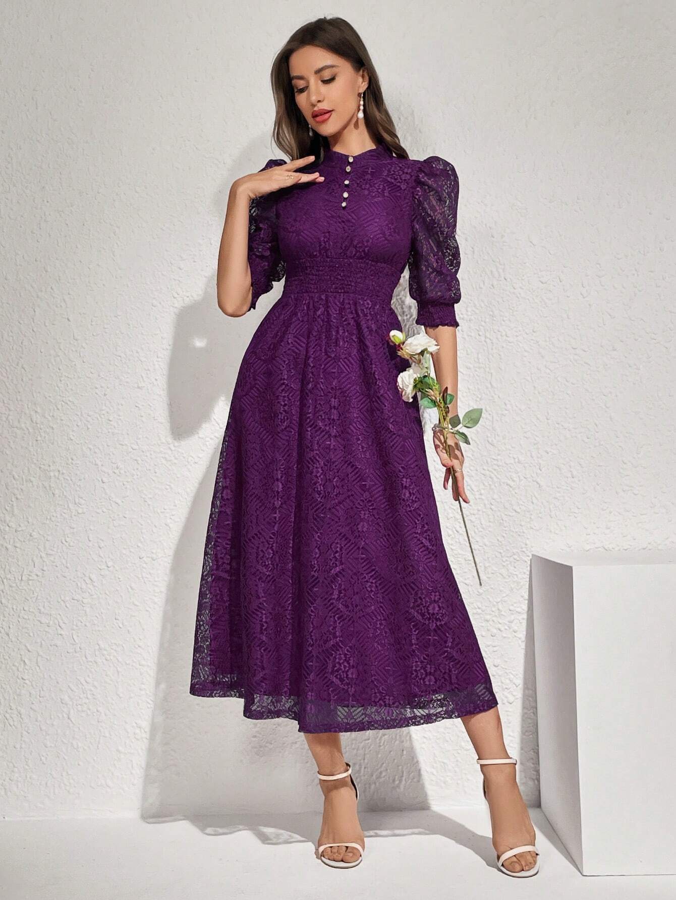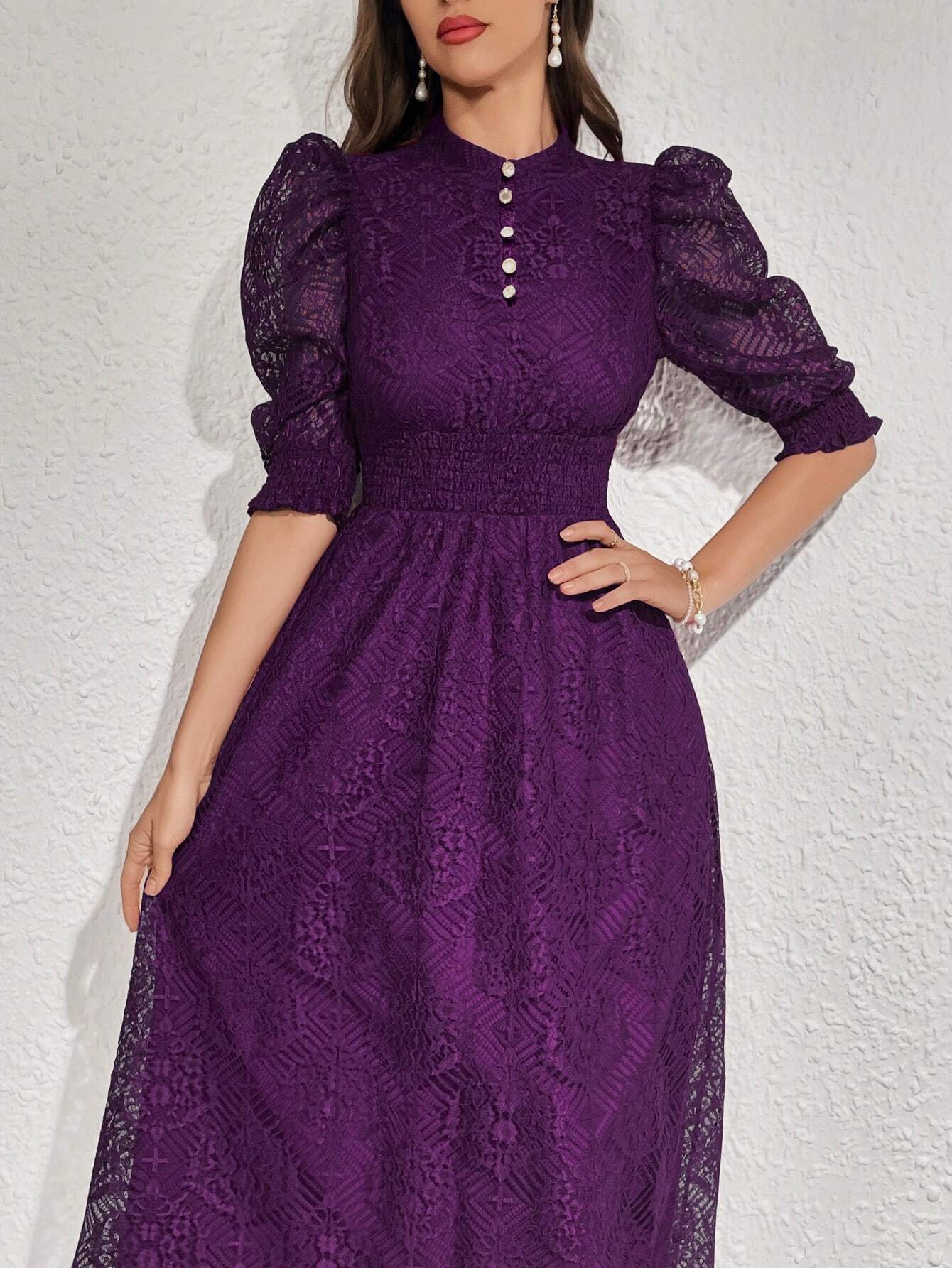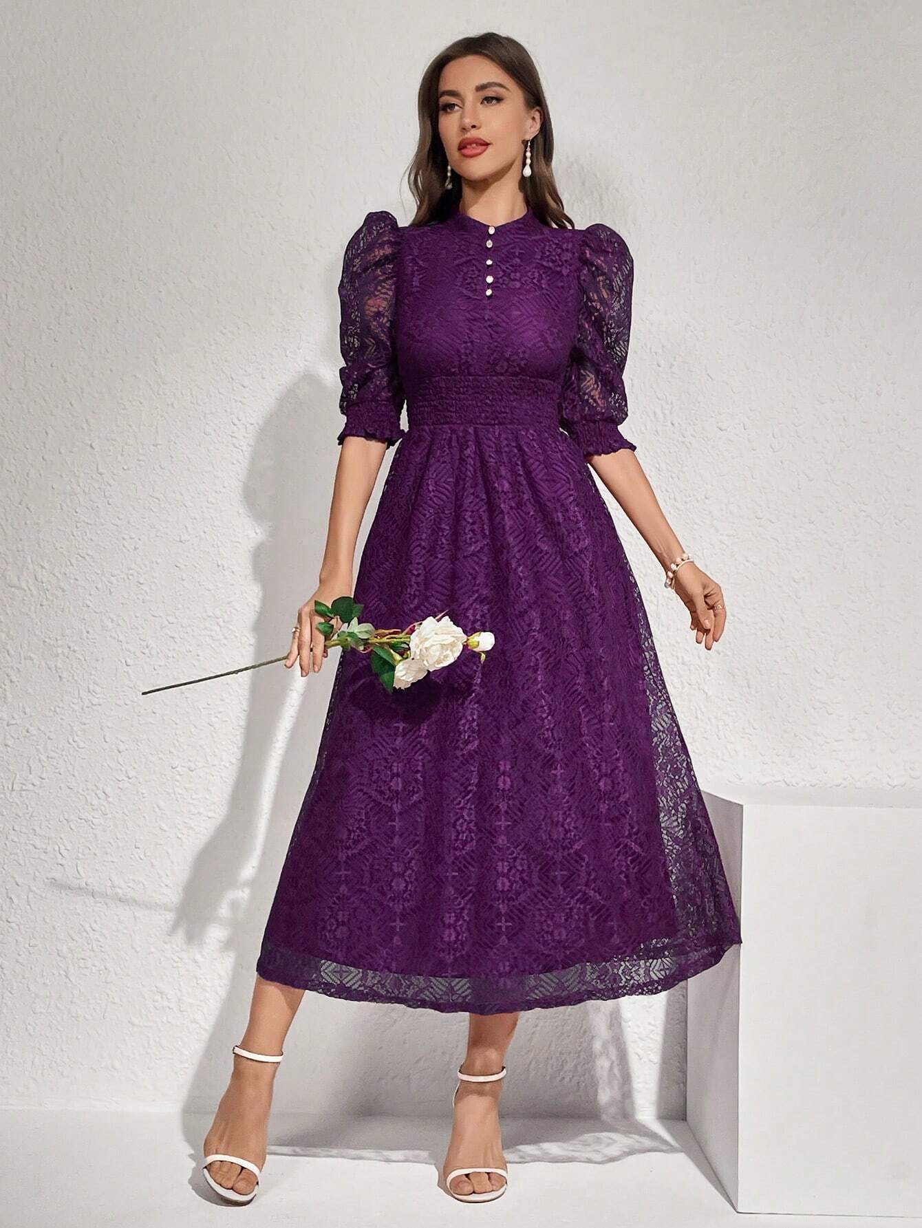 Modelyn Robe longue élégante pour femmes avec manches bouffantes en dentelle, taille cintrée et bouton. Robe de soirée longue pour femmes
