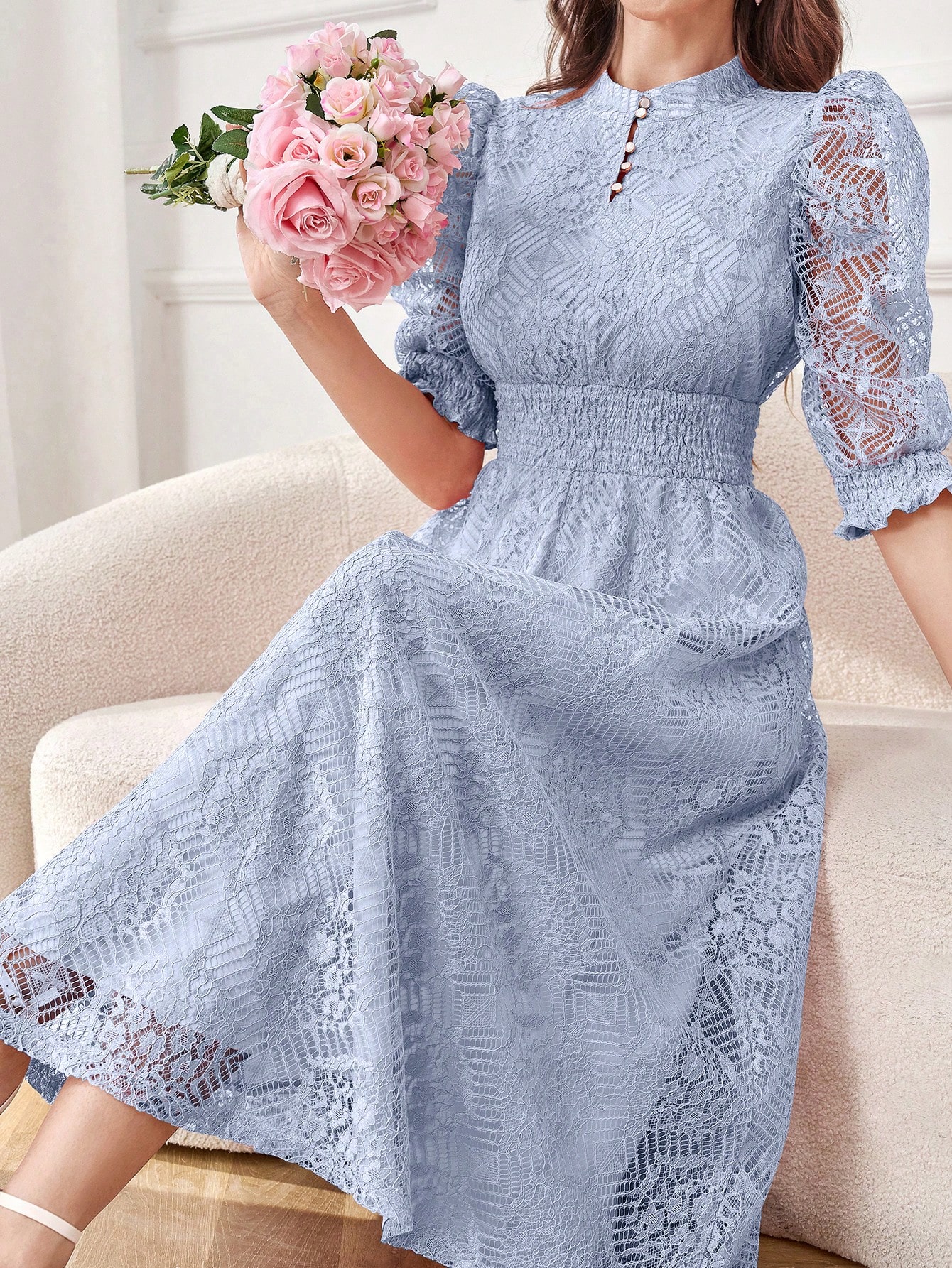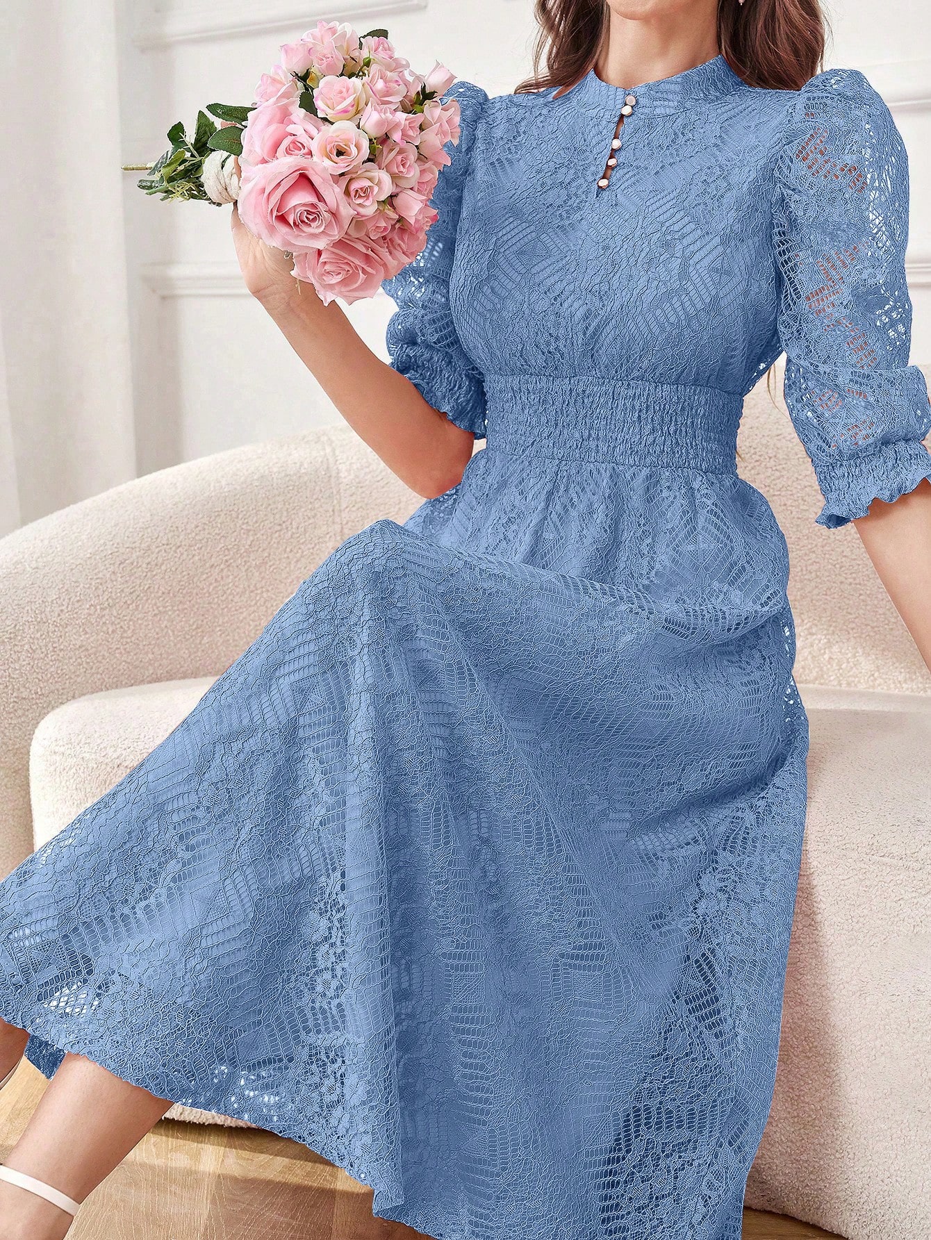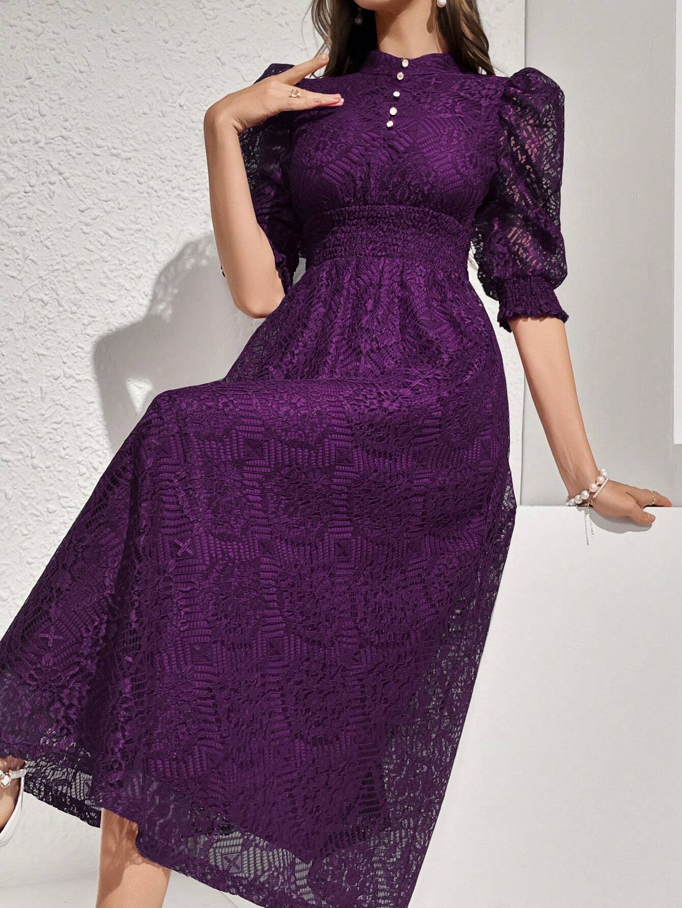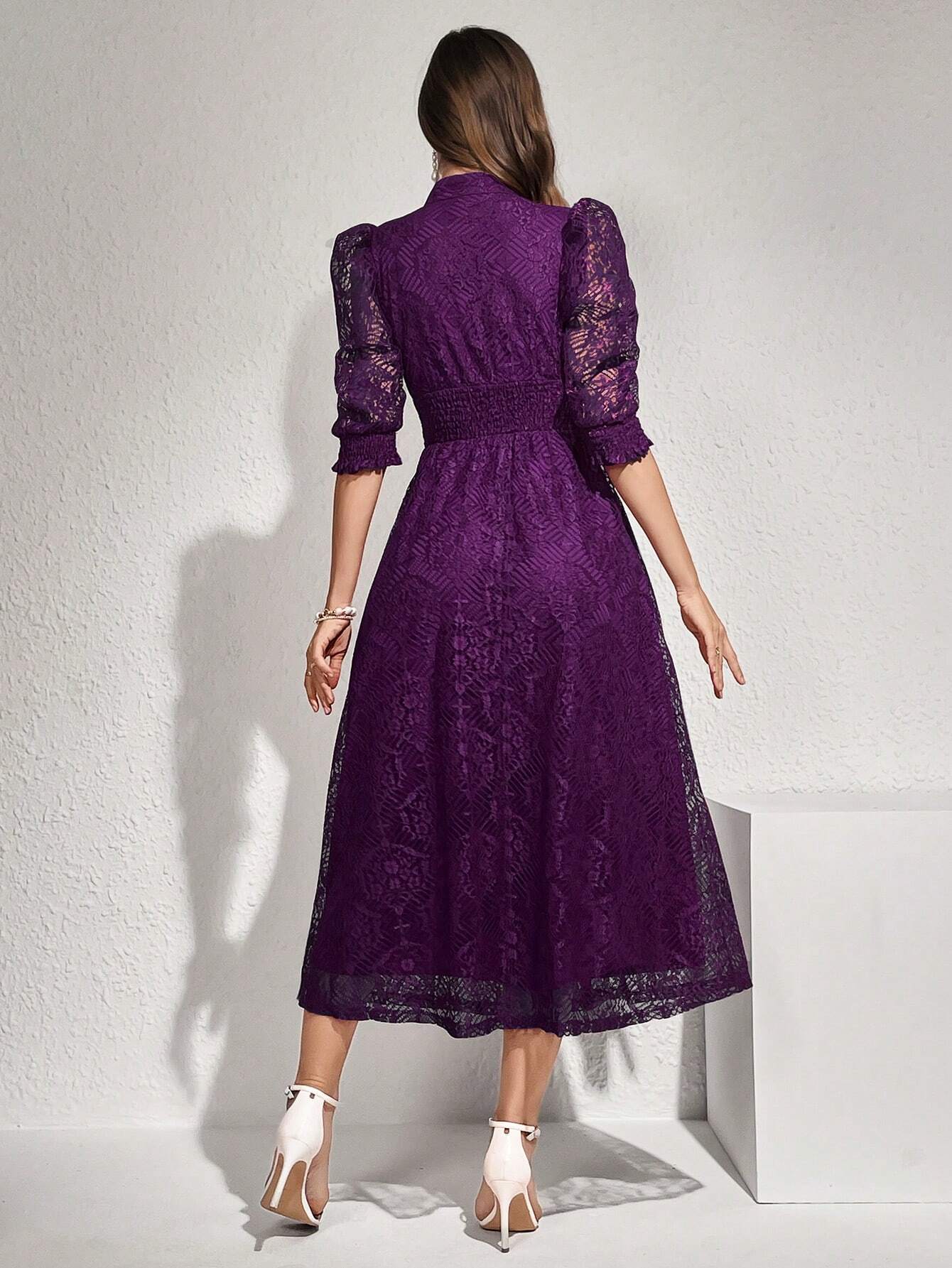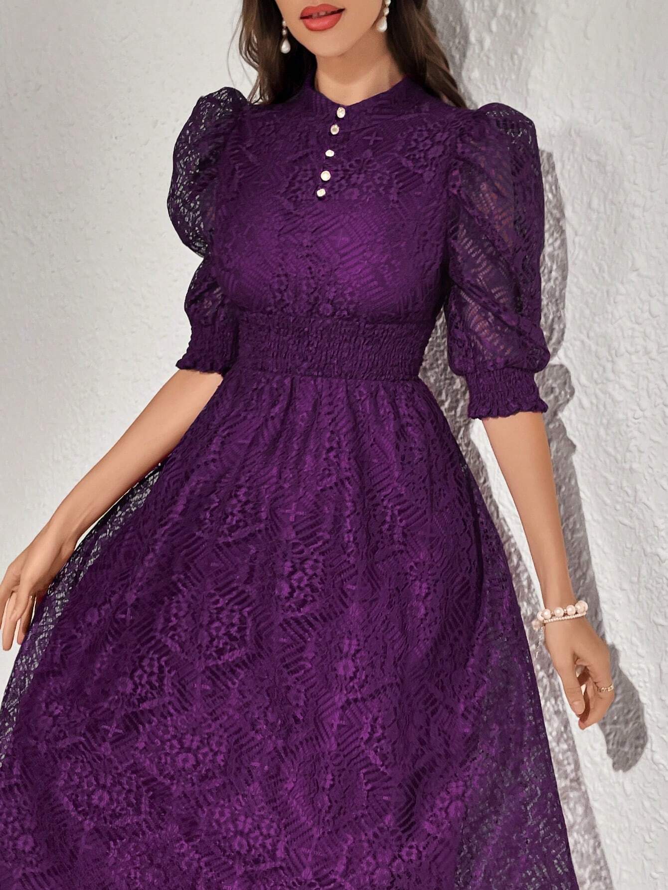 Modelyn Robe longue élégante pour femmes avec manches bouffantes en dentelle, taille cintrée et bouton. Robe de soirée longue pour femmes