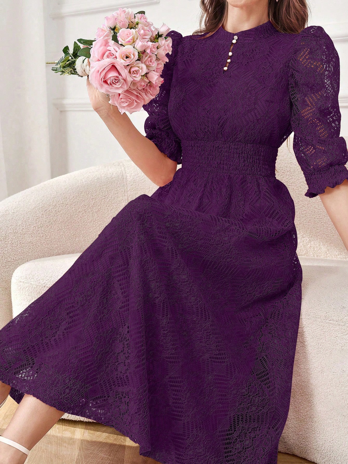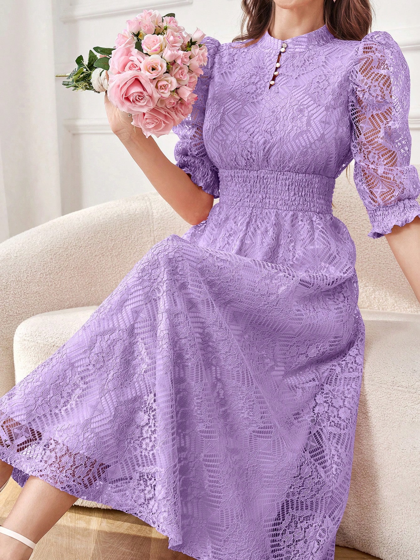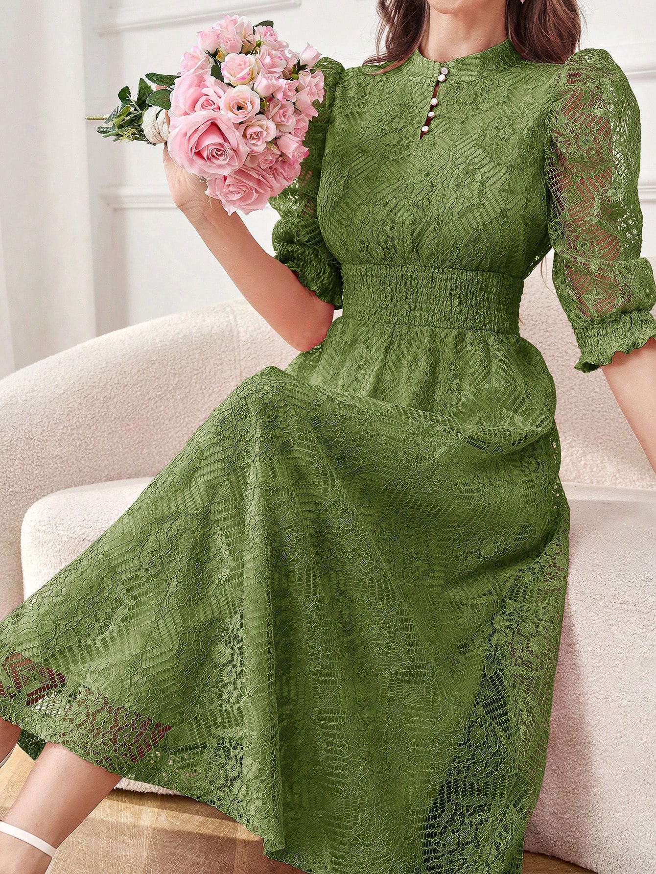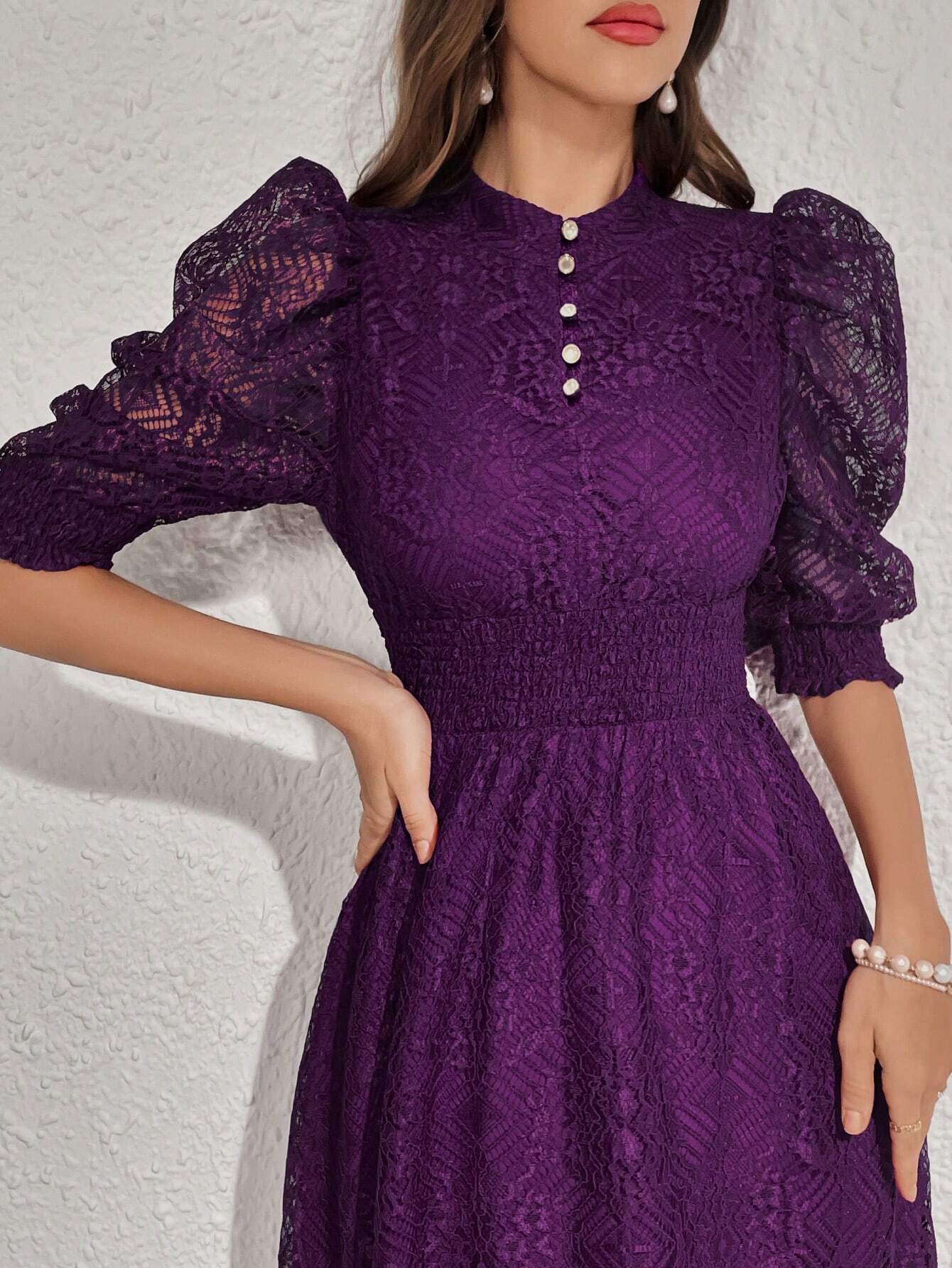 Modelyn Robe longue élégante pour femmes avec manches bouffantes en dentelle, taille cintrée et bouton. Robe de soirée longue pour femmes